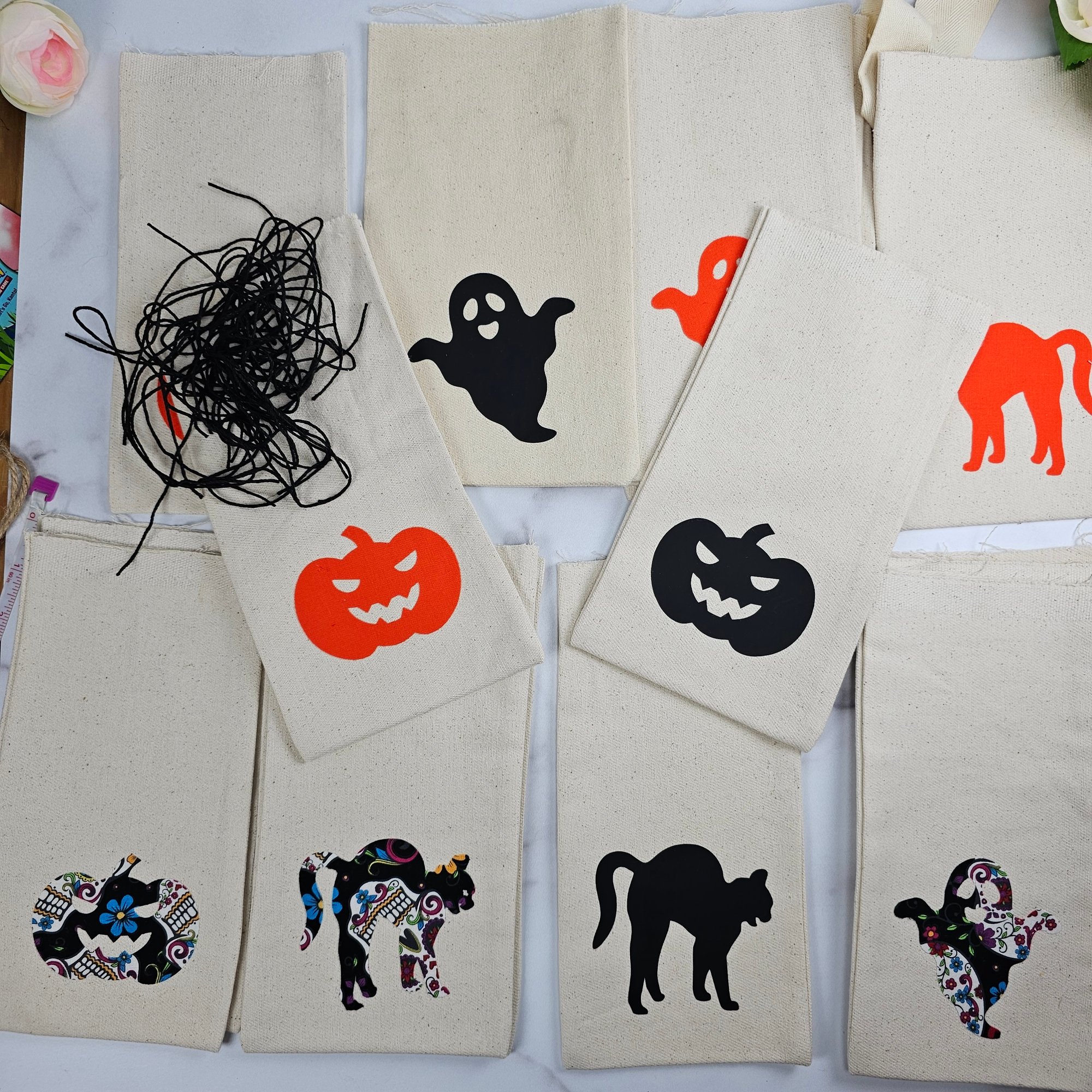 Organic cotton Halloween treat bags made from bolt ends. Approximately 9x5 in. 15 count. Hemp tie strings included. Variety pack includes ghosts, cats and pumpkins in applique and iron on. Washable.