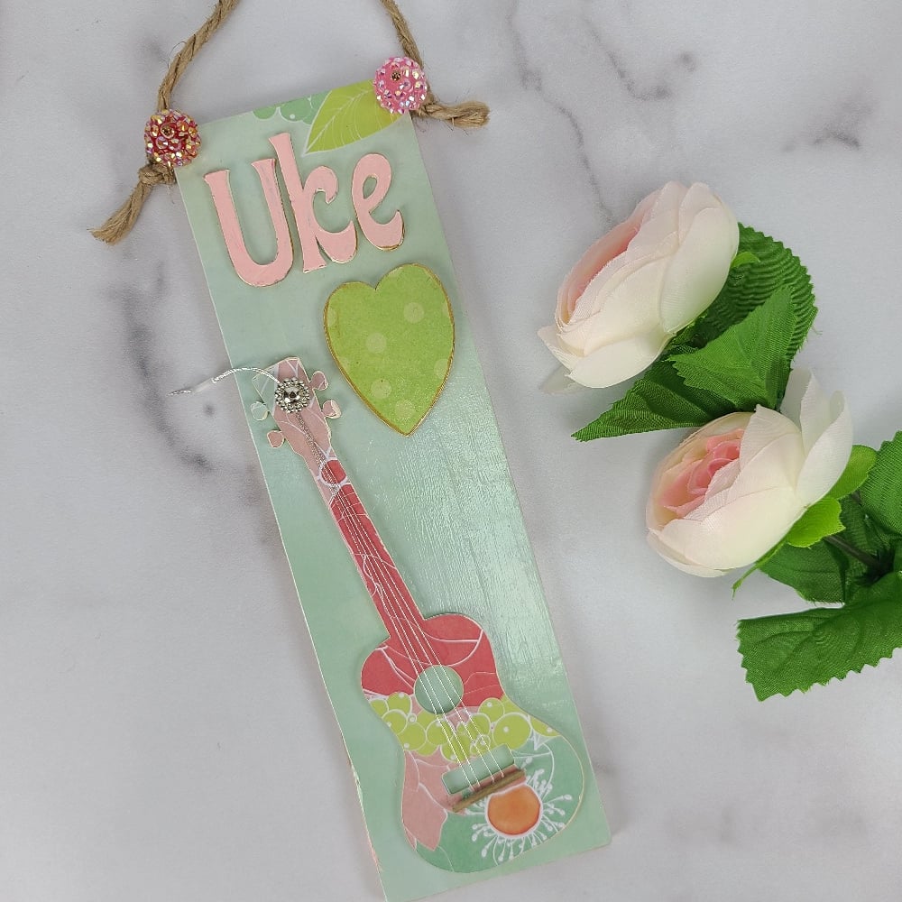 Uke love. This charming little ukulele is complete with shiny strings and a gilt edged heart. Upcycled wood and mixed media. Organic hemp hanger.