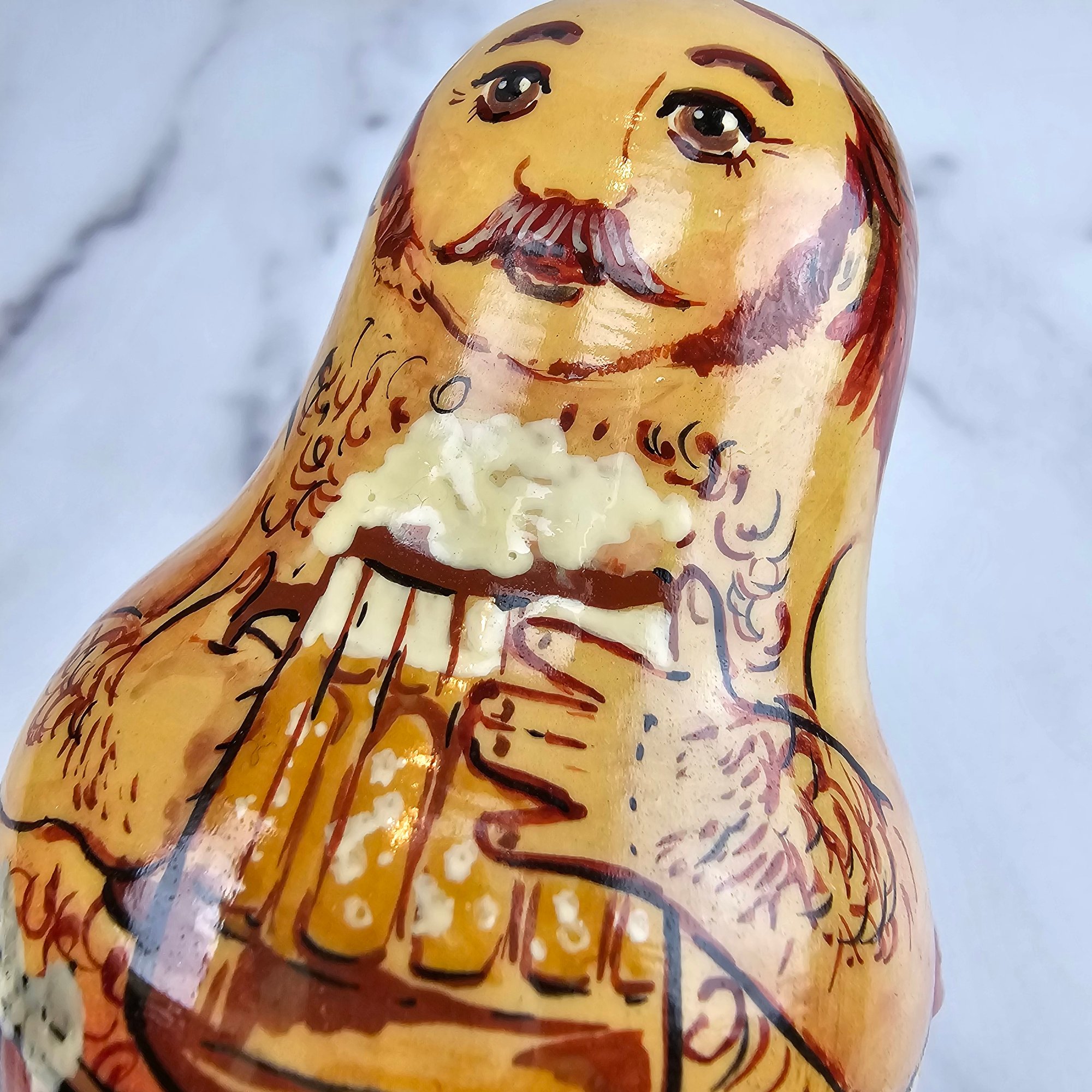 Russian, handcrafted roly poly, beer drinking man. Very rare. Musical wobble toy. approximately 5 inches tall. Charming, gentle chime sound.
